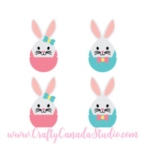 This listing includes four Egg Shaped Easter Bunny designs in SVG format. All four bunnies will open together within your cutting program, so Ungroup will be needed, perhaps more than once, to separate your bunnies and all their parts. Once ungrouped you can delete what you don’t want to use.