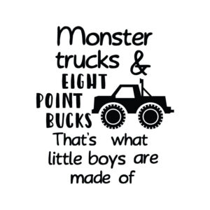 This fun quote for boy, Monster Trucks And Eight Point Bucks That’s What Little Boys Are Made Of, comes in SVG format, and features a monster truck graphic. It’s perfect for a little boys bedroom or nursery!