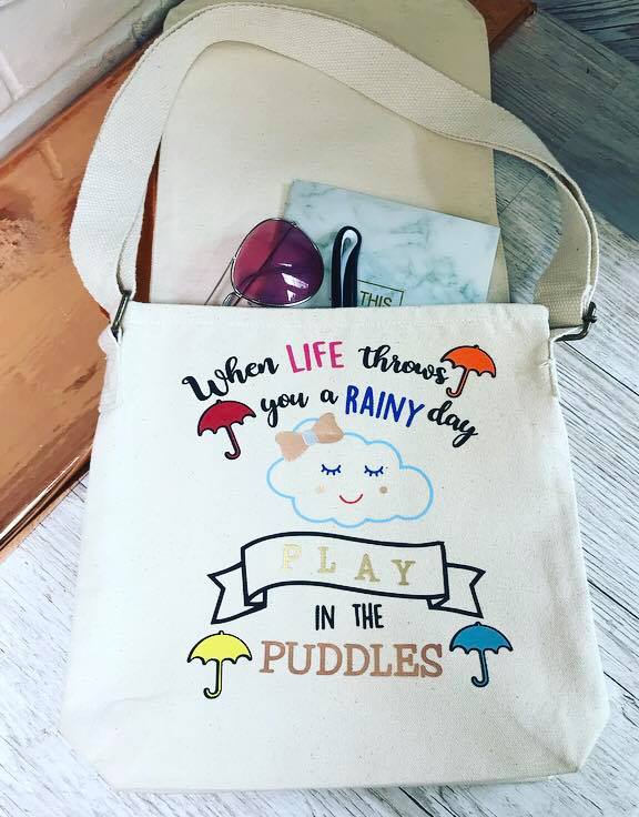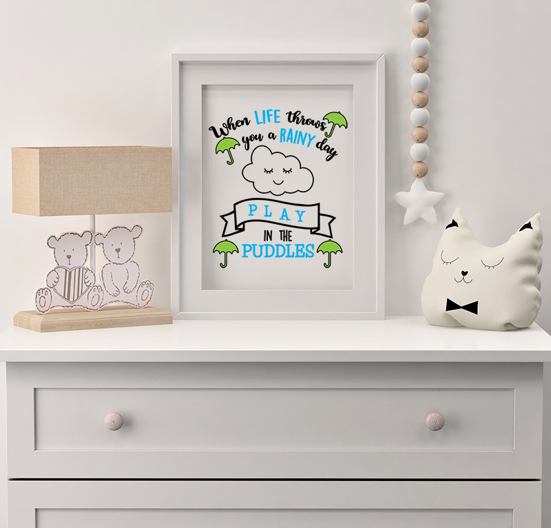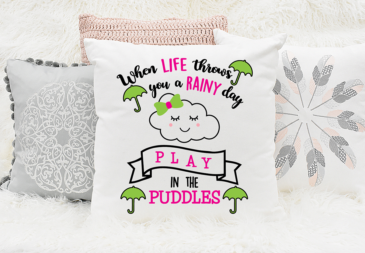 This inspirational quote, When Life Throws You A Rainy Day Play In The Puddles, comes in SVG format, and features a cloud and umbrellas.