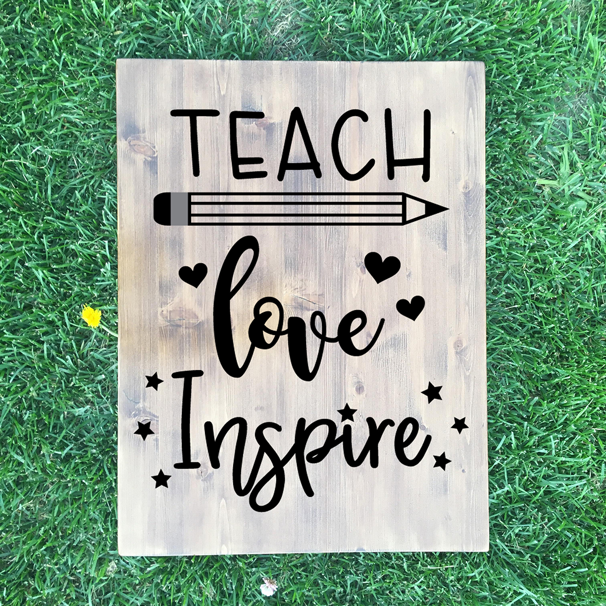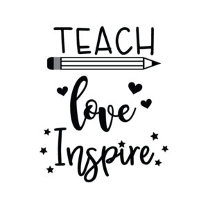 This Teach Love Inspire quote comes in SVG format, and features a pencil, stars, and hearts.