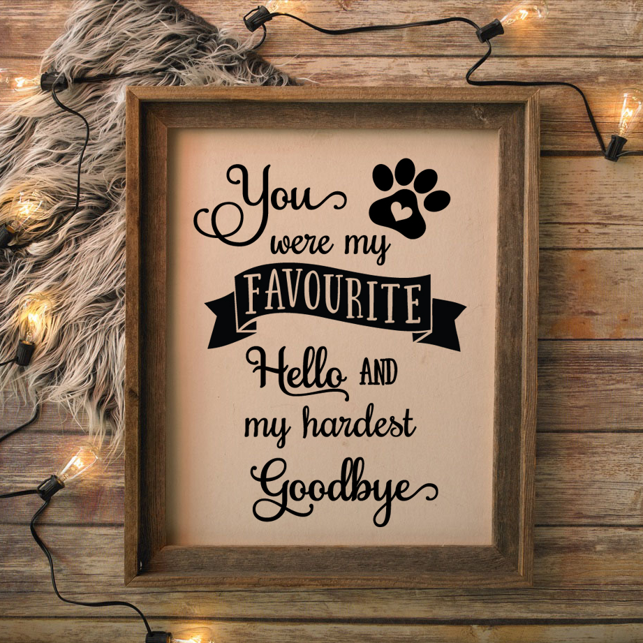 This sweet quote You Were My Favorite Hello And My Hardest Goodbye comes in SVG format, and features a cute little paw print.